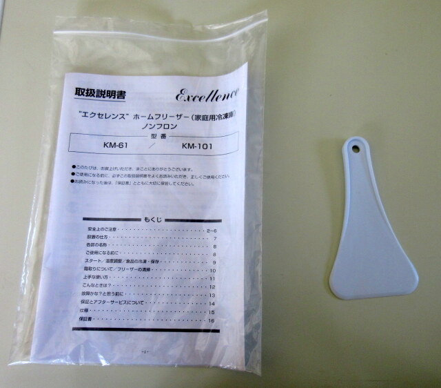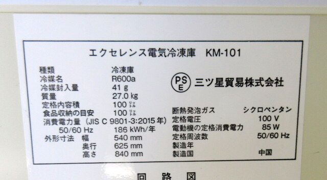 商品名:エクセレンスシリーズ 冷凍庫 メーカー:三ツ星貿易 型番:KM-101 年式:2015年 電源:単相100V (50/60Hz) 消費電力:0.085kW 重量:27kg 有効内容量:100L 外形寸法:W540×D625×H840mm 付属品:写真に写っているものですべてです 取扱説明書:あり 定価:\39,800- 未使用品です。